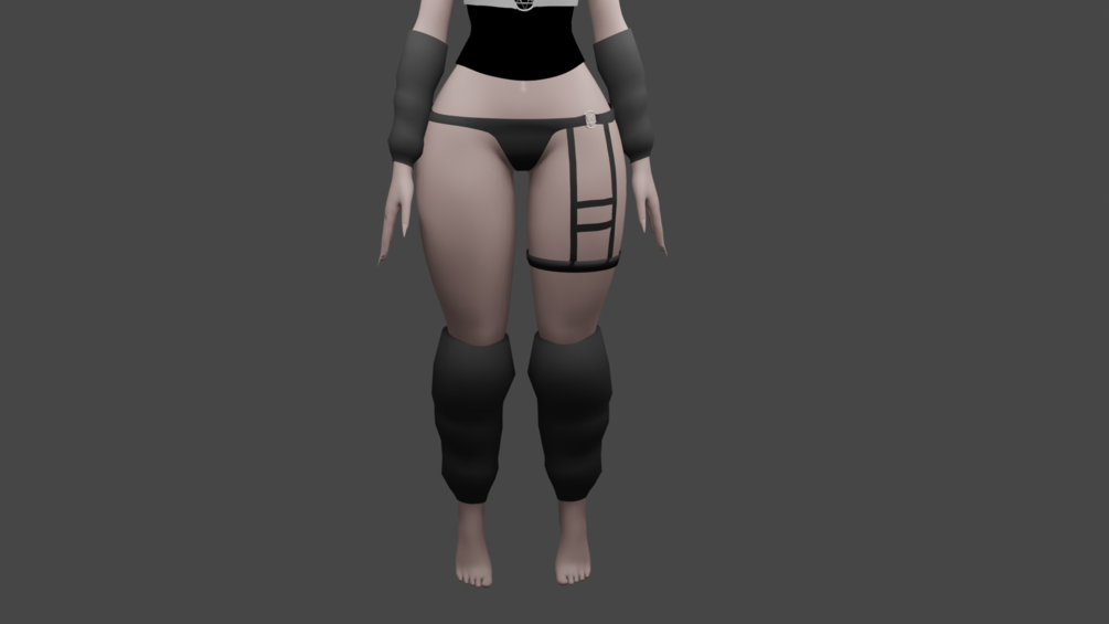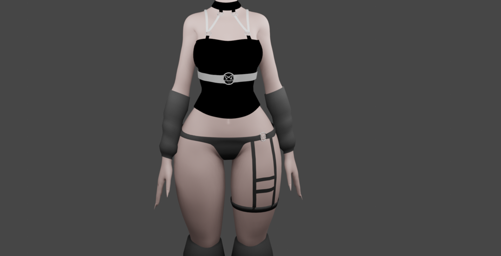 Package includes arm and leg warmers, Tank top with pentagrams and straps, and a garter. Not rigged, fitted to Panda's Female Heeled Base. Base is NOT included. Materials not included, but a fur shader on the warmers could be cute :)